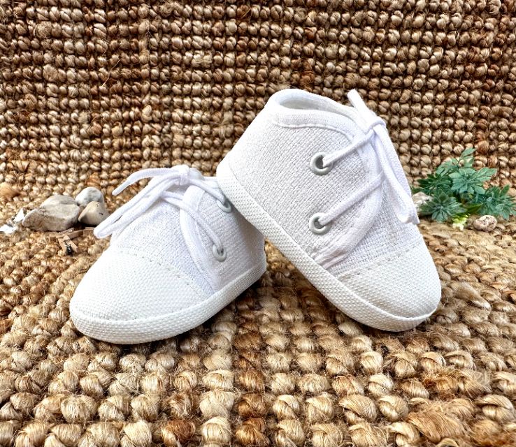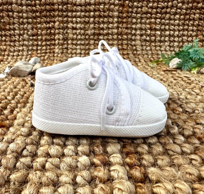 Trampki białe Oryginalne, wiązane trampeczki z beżowej tkaniny o grubym splocie. tk.zew. - tkanina (polyester)tk.wew.- włóknina obuwnicza (polyester)spód- cortina (PVC ftalan free) rozmiary: 10,11,12,13 - długość wkładki w cm. wewnątrz Galeria