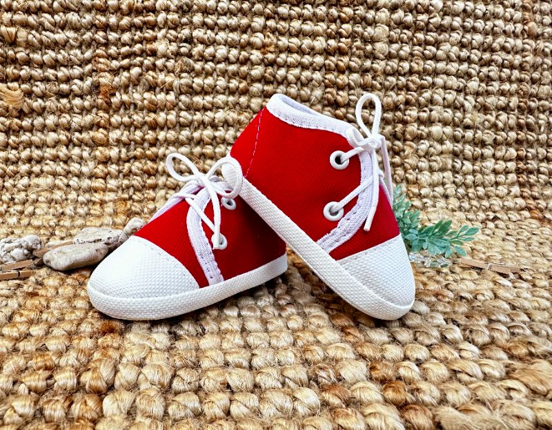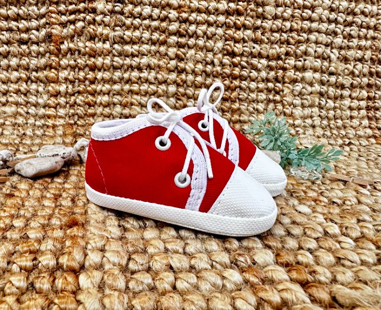 Trampki czerwone Oryginalne, wiązane trampeczki z czerwonego jeansu. tk.zew. - tkanina jeans (polyester)tk.wew.- włóknina obuwnicza (polyester)spód- cortina (PVC ftalan free) rozmiary: 10,11,12,13 - długość wkładki w cm. wewnątrz Galeria
