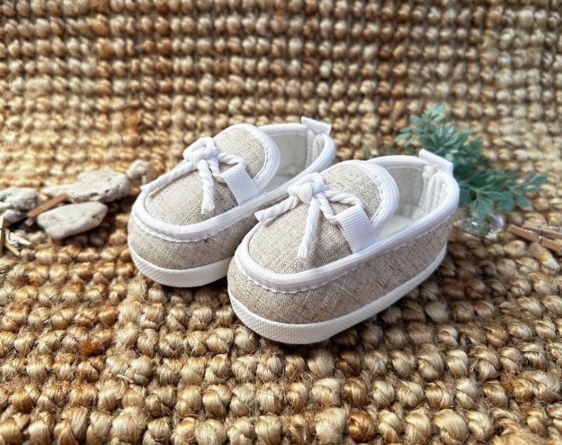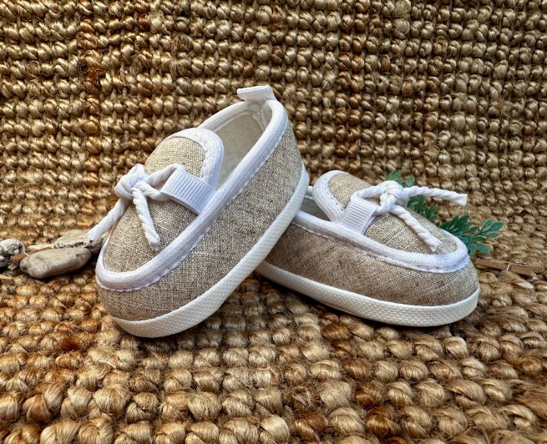 Modne i eleganckie mokasynki w kolorze beżowym.