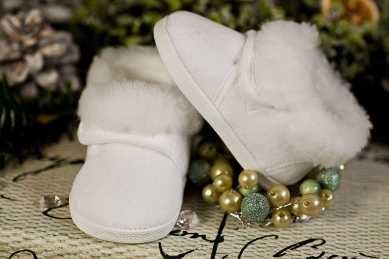 Zapinane na rzep, eleganckie buciki z białego, bawełnianego weluru z obszyciem futerkowym dookoła kostki.