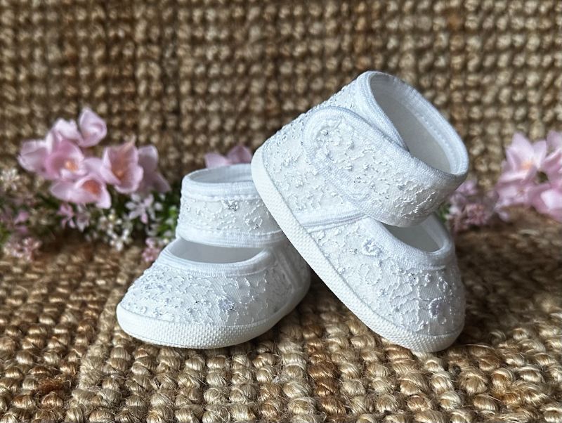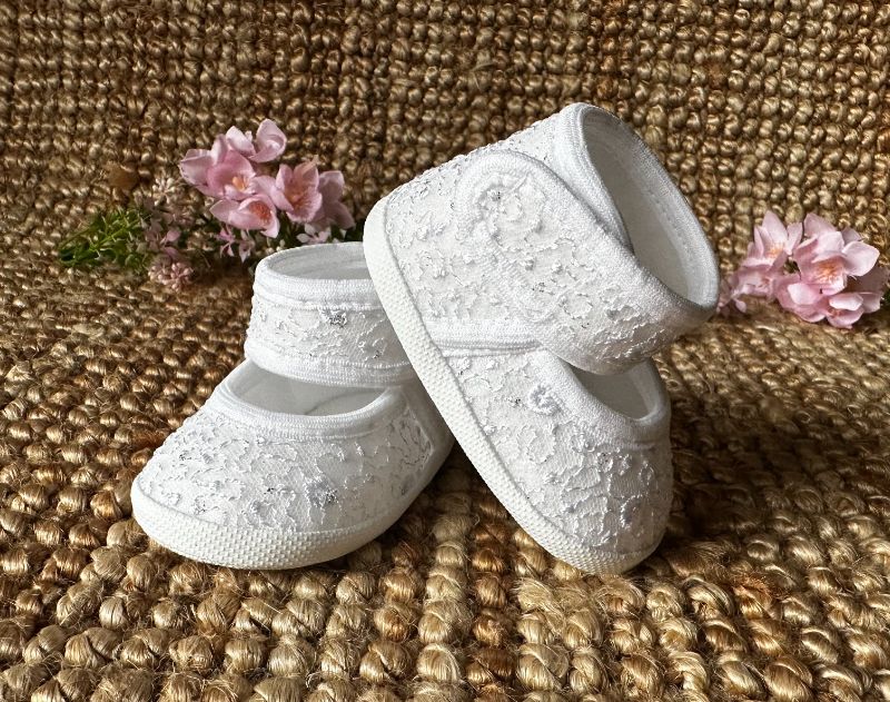 Balerinka koronka Biała - 103KB Wysublimowane buciki z białej, połyskującej koronki , zapinane na rzep. tk.zew.- koronka (polyester)tk.wew.- włóknina obuwnicza (polyester)spód- cortina (PVC Ftalan free) rozmiary: 9,10,11,12,13 Galeria