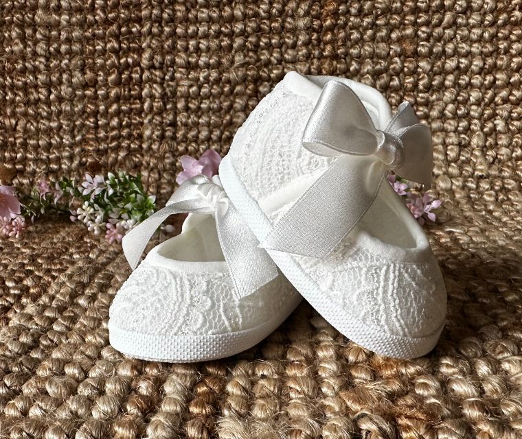 Szykowne buciki z delikatnej koronki w kolorze ecru , sznurowane satynową szarfą.