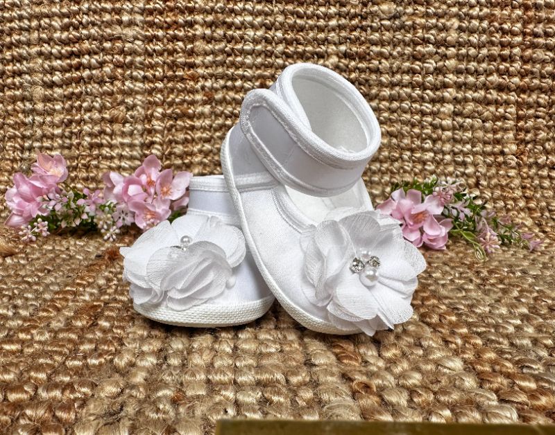 Przepiękne, białe, satynowe buciki, zapinane na rzep, ozdobione oryginalnym kwiatkiem z perłowo-diamentowym środkiem.