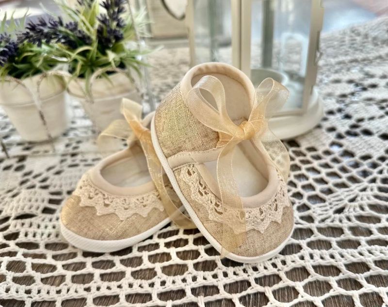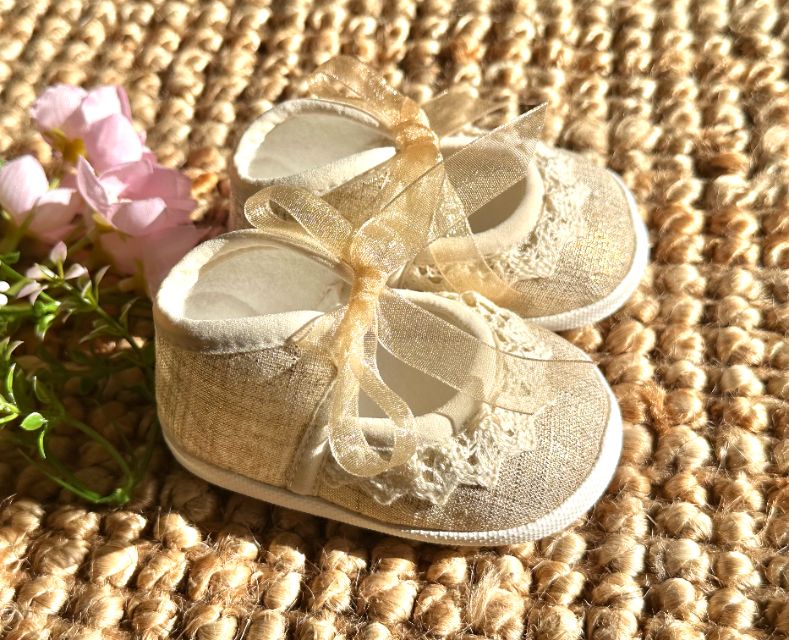 Niezwykłe buciki z delikatnego złotego lnu w kolorze złot0-beżowym, sznurowane organtynową wstążką. tk.zew.- len tk.wew.- włóknina obuwnicza (polyester) spód- cortina (PVC Ftalan free) rozmiary: 9,10,11,12