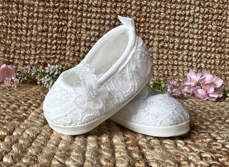 Baletki koronkowe III Białe-120 KB - NOWOŚĆ Ekskluzywne buciki z białej, przepięknej koronki z ozdobnym tiulowym kwiatuszkiem. tk.zew. - koronkatk.wew.- włóknina obuwniczaspód- cortina rozmiary: 9,10,11,12,13 Galeria