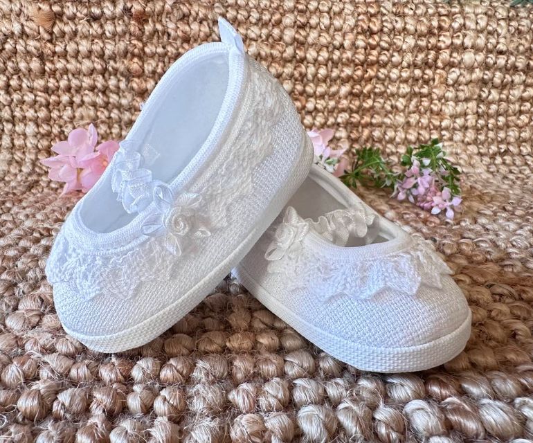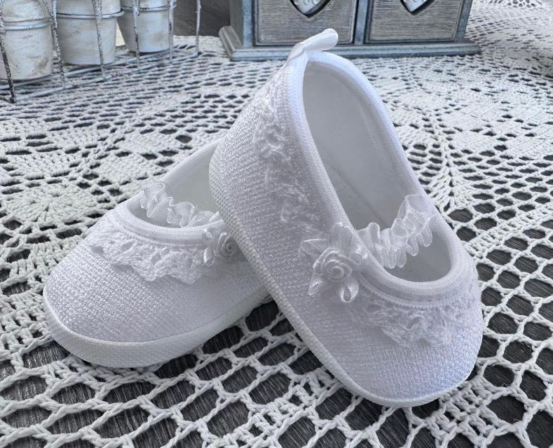 Białe, przepiękne, lniane buciki w stylu vintage. Obszyte delikatną, bawełnianą koronką.