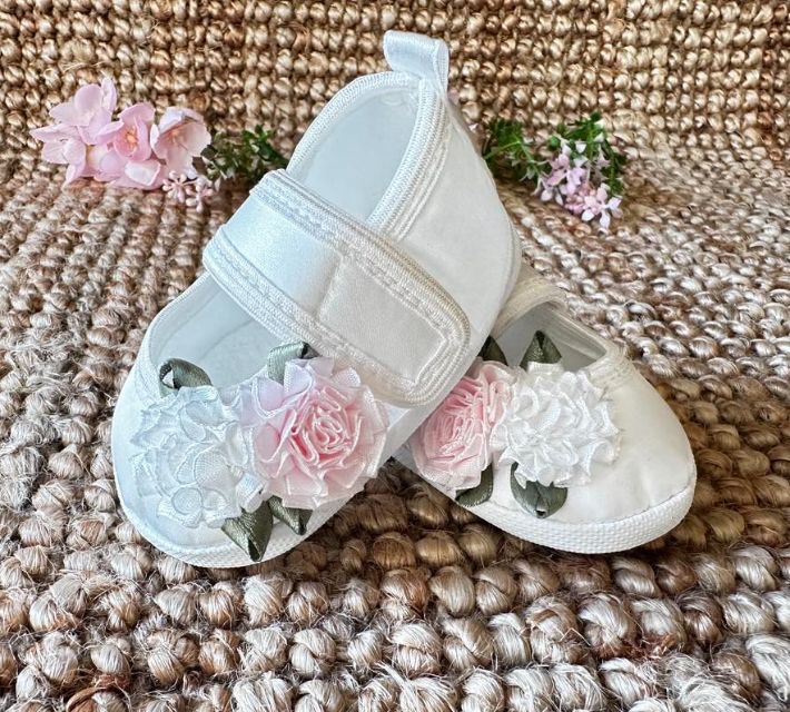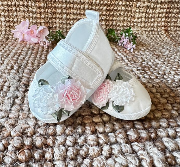 Przepiękne buciki uszyte ze sztucznego jedwabiu w kolorze ivory, zapinane na rzep, z wszytą antypoślizgową wyprofilowaną stopką. Ozdobione oryginalnymi goździkmi w dwóch kolorach: białym i jasnorózowym.