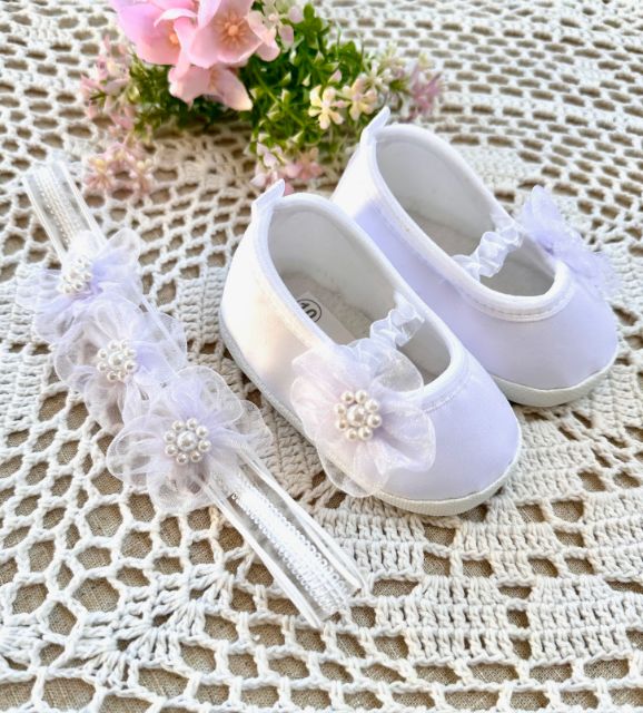 Przepiękne, satynowe buciki w kolorze białym, ozdobione oryginalnym satynowym kwiatem z perłowym środkiem.