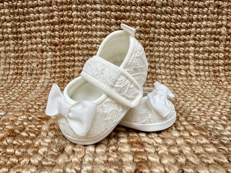 Ekskluzywne buciki z przepięknej koronki w kolorze ecru z ręcznie wykonana kokardą rypsową.