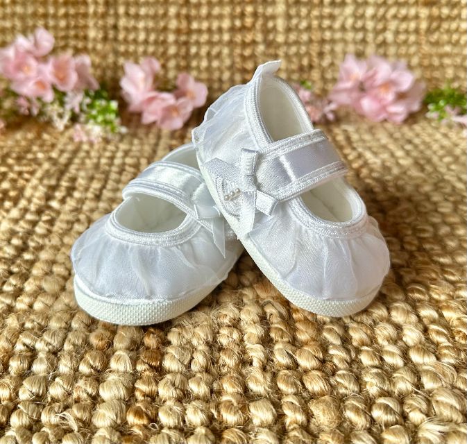 Niepowtarzalne, piękne buciki uszyte z białej satyny, zapinane na rzep, obszyte organtynową falbanką.