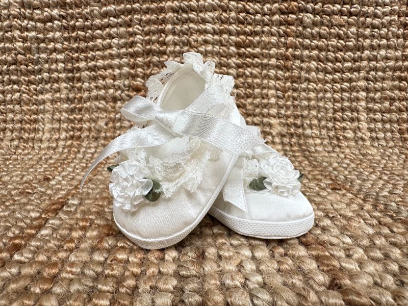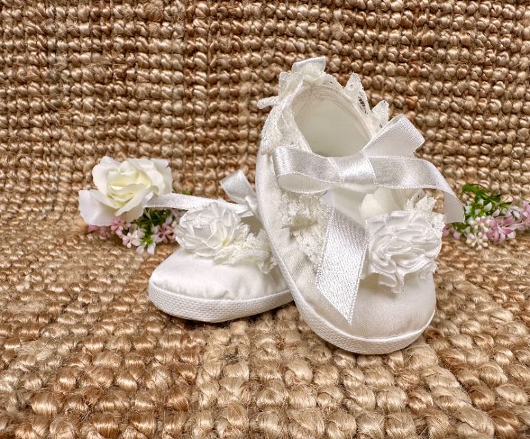 Ekskluzywne buciki uszyte z sztucznego jedwabiu w kolorze Ivory, obszyte piękną koronką i ozdobione goździkiem na górze noska.