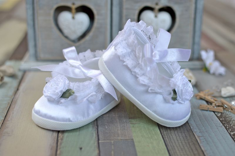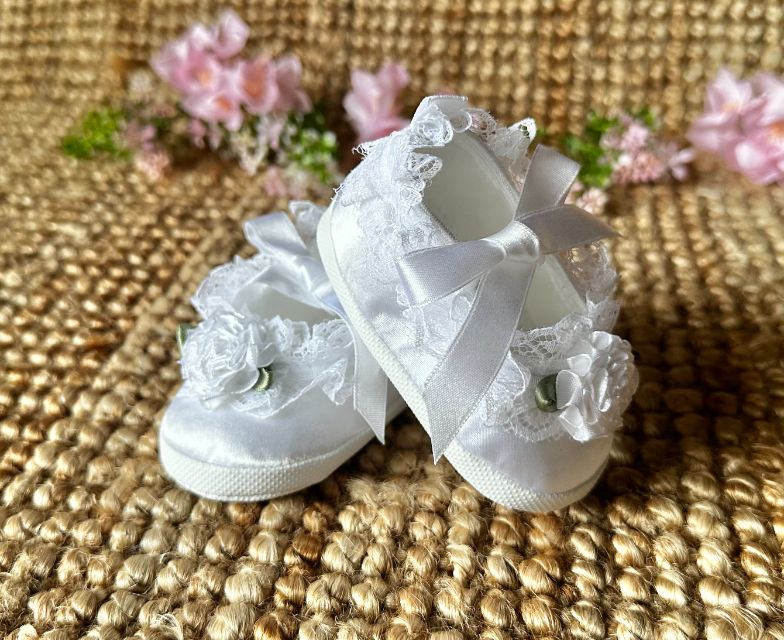 Ekskluzywne buciki z białej satyny, obszyte piękną koronką i ozdobione białym goździkiem na górze noska.