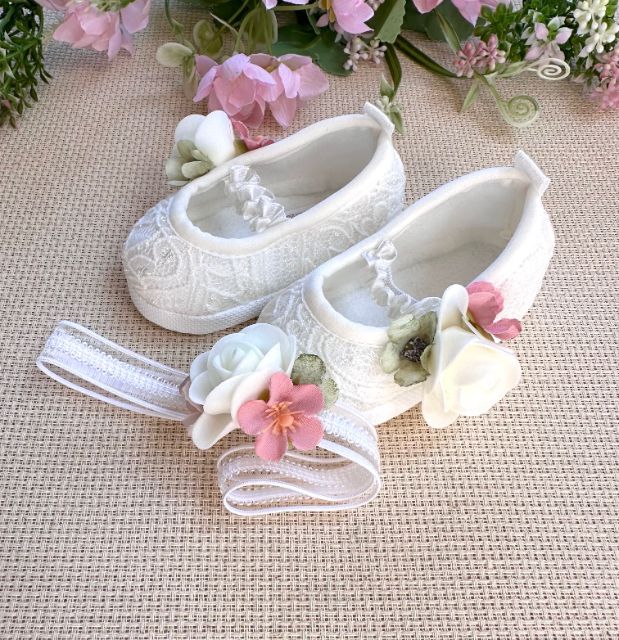 Ekskluzywne buciki z opaską w komplecie "Limited edition" z przepięknej koronki w kolorze białym z oryginalnym bukiecikiem kwiatowym. Miękkie i przyjazne dziecku.