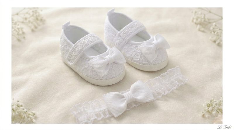 Ekskluzywny komplet buciki + opaska uszyte z przepięknej koronki w kolorze białym z ręcznie wykonana kokardą rypsową.