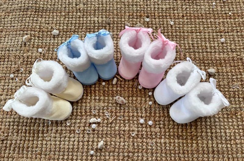 Welurowe, kolorowe, kozaczki z wygodnym rozcięciem z tyłu i satynową tasiemką regulującą obwód nózki.
