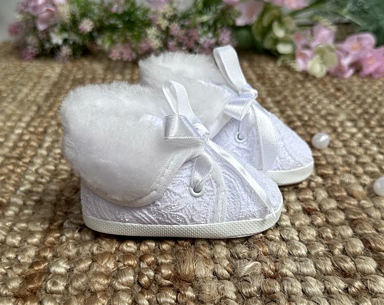 M013 KB - NOWOŚĆ Sznurowane satynową tasiemką, cieplutkie buciki z prześlicznej koronki w kolorze białym. Tk.zew.-koronkatk.wew.- dzianina runowa "miś"spód- cortina rozmiary:10,11,12,13 - długość wkładki w cm. wewnątrz Galeria