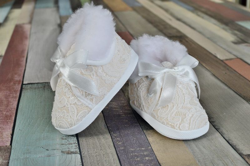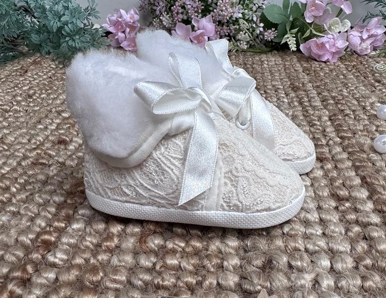 M013KE - NOWOŚĆ Sznurowane , cieplutkie i zjawiskowe buciki uszyte z przepięknej koronki w kolorze ecru na białym futerku, sznurowane satynową wstążką .Tk.zew.-koronkatk.wew.- dzianina runowa, miśspód- cortin Galeria
