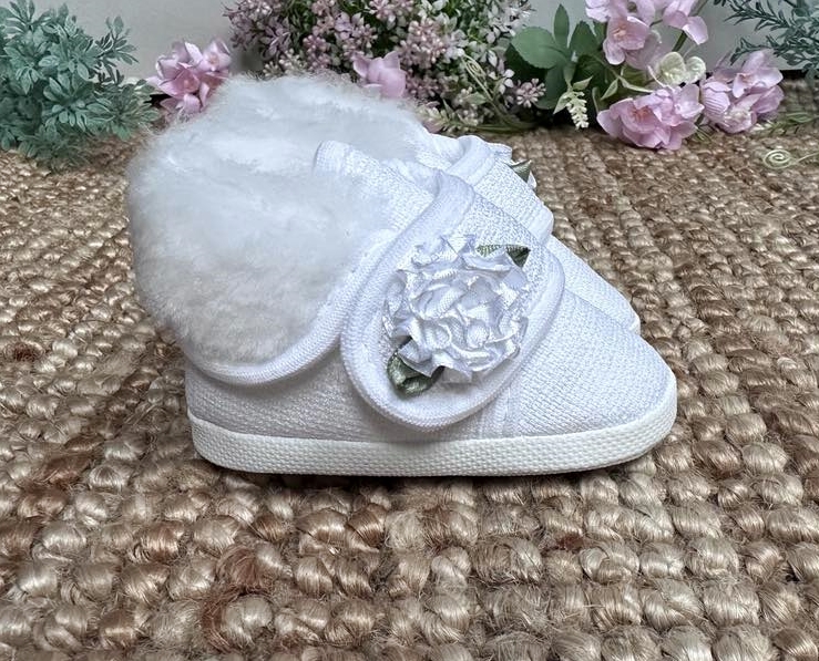 Lniane Trzewiki uszyte z białej tkaniny na mięciutkim futerku. Zapinane na rzep z odkładanym kołnierzem.