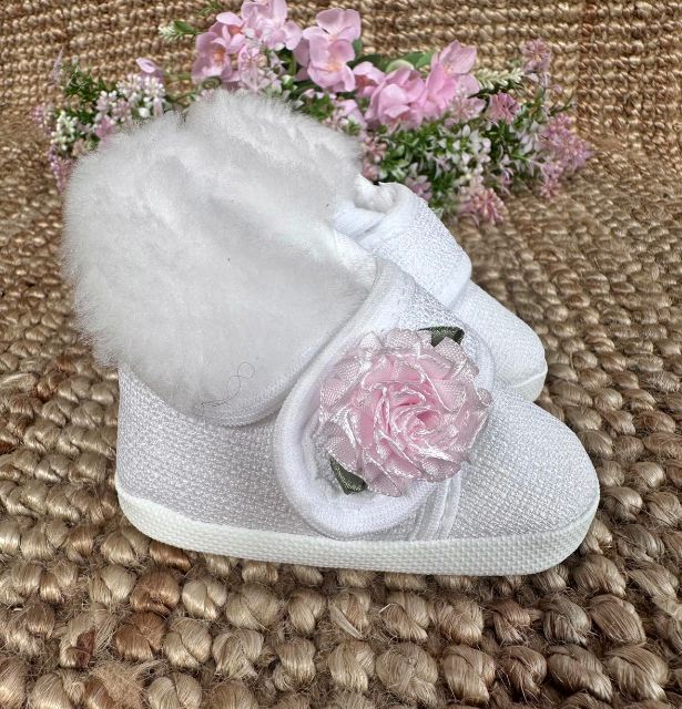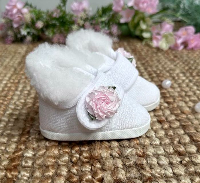 Lniane Trzewiki uszyte z białej tkaniny na mięciutkim futerku. Zapinane na rzep z odkładanym kołnierzem.