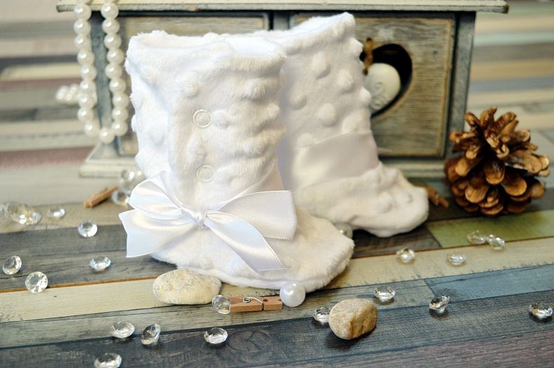 Kozaczki Minky z kokardą Cieplutkie buciki do chrztu, uszyte w formie kozaczków z dzininy minky na polarowej podszewce zapinane na springi, ozdobione białą satynową kokardą. Dostępne w rozmiarach:10,11 Galeria