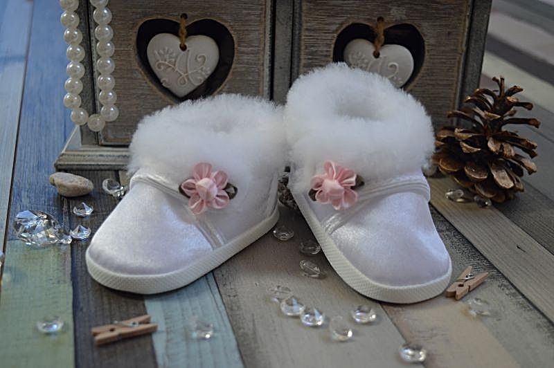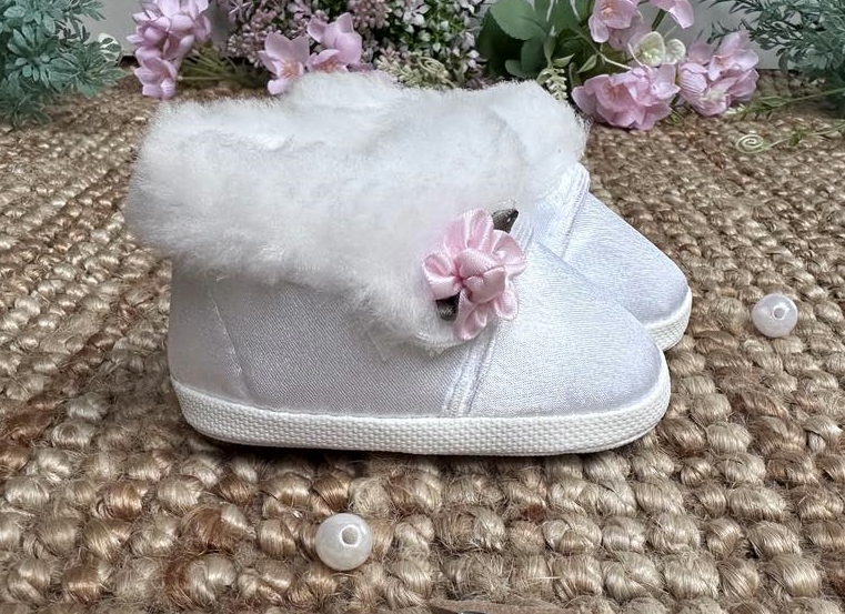 MZ008 SB Satyna z kwiatem Zapinane na rzep,delikatne buciki z białej satyny ozdobione różowym kwiatem.Tk.zew.-satyna obszyta dzianiną runowątk.wew.- włóknina obuwniczaspód- cortina rozmiary:10,11,12,13- długość wkładki w cm. wewnątrz Galeria