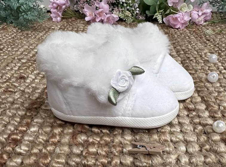 MZ008 WB Welur z różą Zapinane na rzep, eleganckie buciki z białego weluru. Ozdobione na patce białą różyczką.Tk.zew.-welur z obszyciem futerkowymtk.wew.- włóknina obuwniczaspód- cortina rozmiary:10,11,12,13- długość wkładki w cm. wewnątrz Galeria
